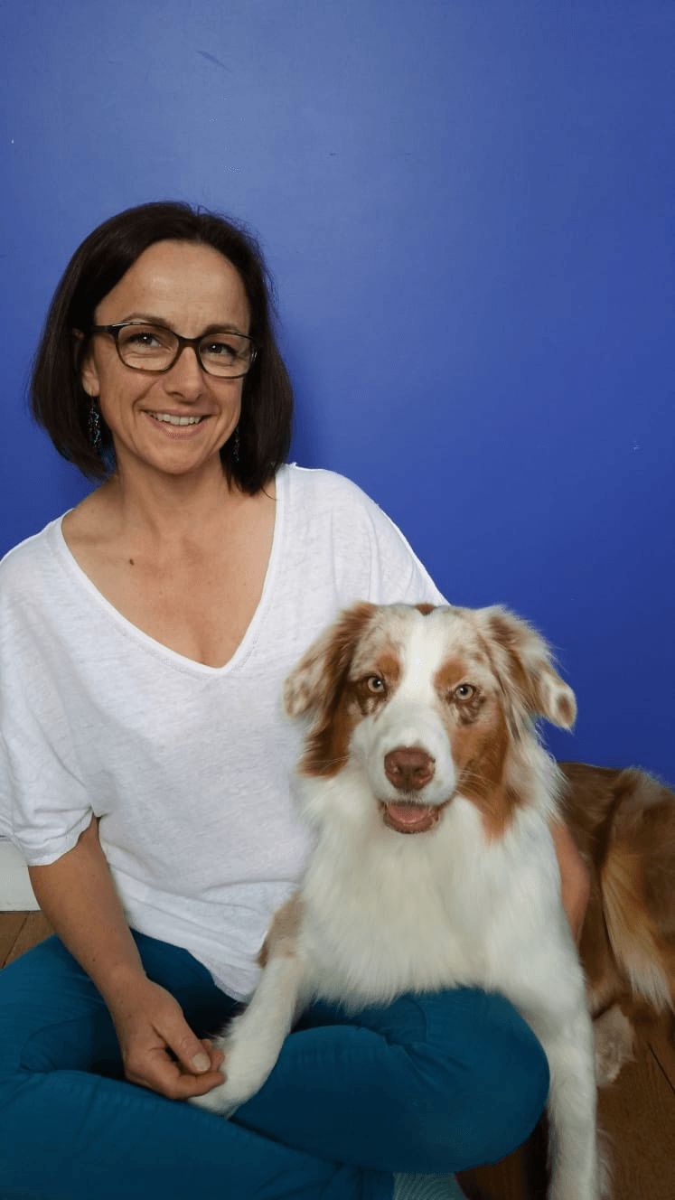 Je travaille avec mes chiens Toffie, ma berger australienne, et Twist, mon spitz allemand.